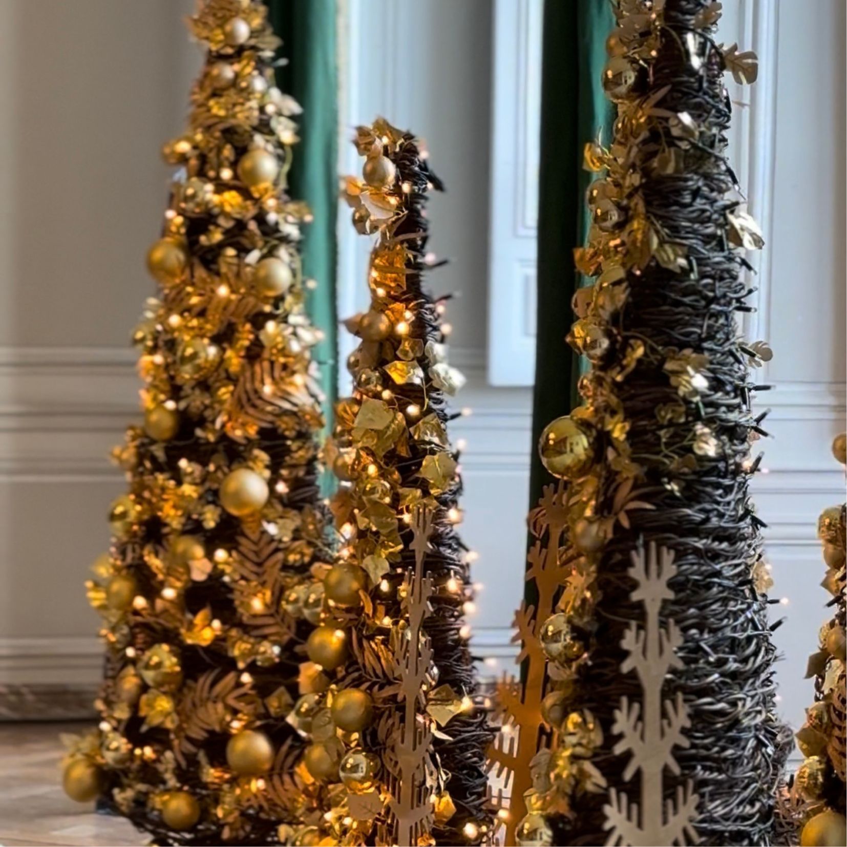 Cette antichambre scintille d’or et d’ivoire : sapins délicatement décorés, cheminée lumineuse, jeux de transparence et reflets dorés composent un décor chaleureux et raffiné. Une ambiance typiquement française, élégante et intemporelle.