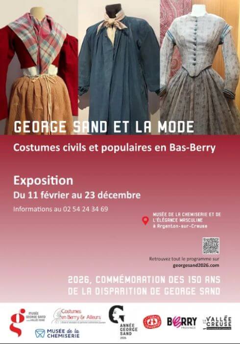 À l’occasion du 150ᵉ anniversaire de la mort de George Sand, le Musée de la Chemiserie présente une exposition sur la mode de 1830 à 1880. Elle explore la distinction entre la mode bourgeoise parisienne, que George Sand peut adopter lors des mondanités, et la mode populaire décrite dans ses romans. Les costumes exposés à Argenton reflètent cette influence tout en conservant leur identité régionale.